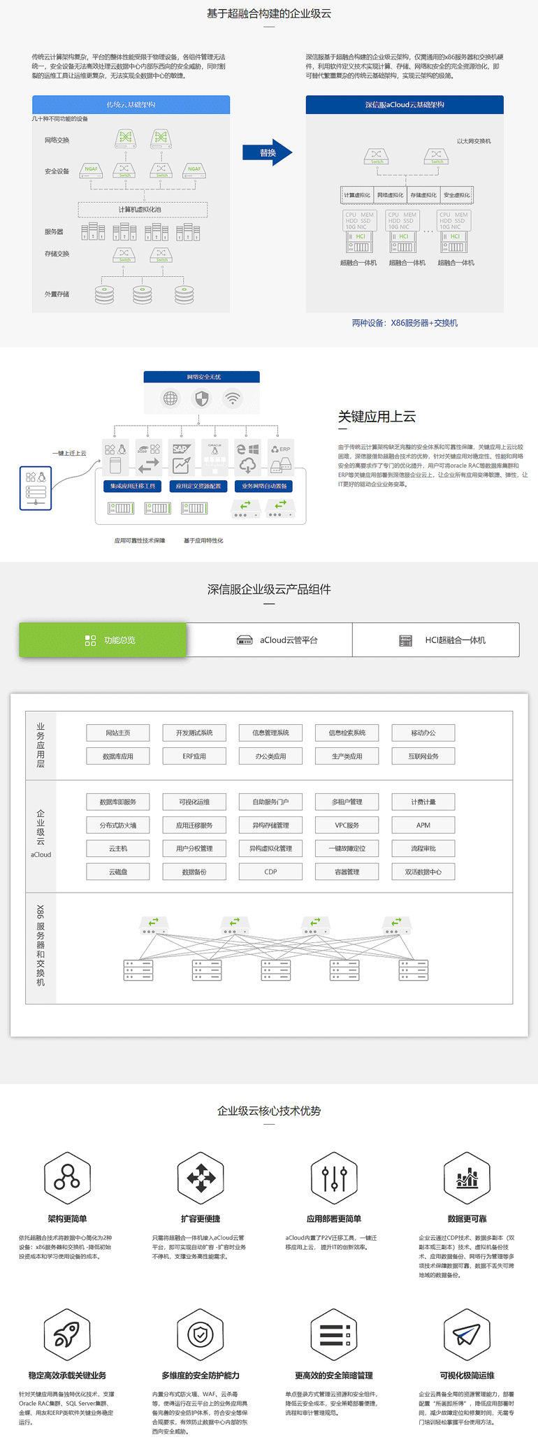 深信服企業(yè)級(jí)云是新一代的云IT架構(gòu),基于創(chuàng)新的超融合技術(shù)構(gòu)建,具備完整的IT基礎(chǔ)設(shè)施服務(wù)能力和運(yùn)維管理服務(wù)能力,并能承載核心數(shù)據(jù)庫(kù)、ERP、財(cái)務(wù)系統(tǒng)、生產(chǎn)系統(tǒng)等企業(yè)關(guān)鍵業(yè)務(wù)應(yīng)用。
