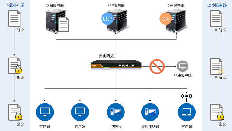加密文檔上傳解密:終端上的文檔上傳到服務器時自動解密,服務器以明文存儲所有文檔,確保服務器上文檔的安全。