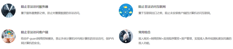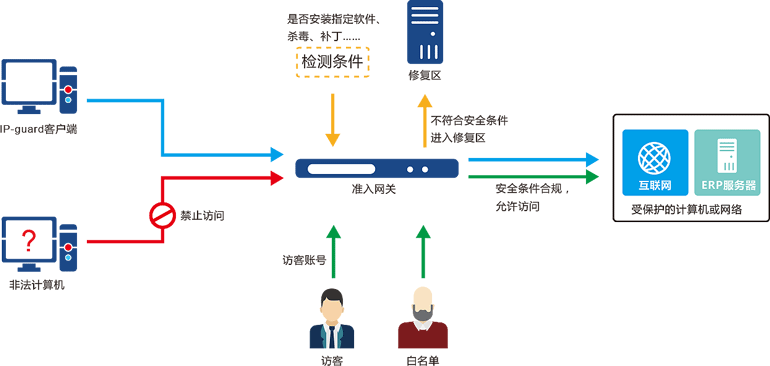 計算機接入企業內部網絡對服務器、互聯網等訪問時,需要經過準入網關嚴格的審核,只有合法的計算機才能連入訪問,非法計算機可根據需要將其引導至隔離區進行修復,或者完全阻斷其訪問。
